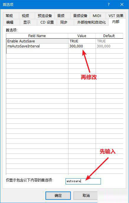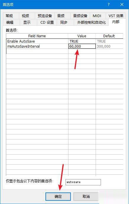 三、在“内部”标签页的下面搜索框中,输入“autosave”,可以看到最后检索出两个参数,如下图所示: