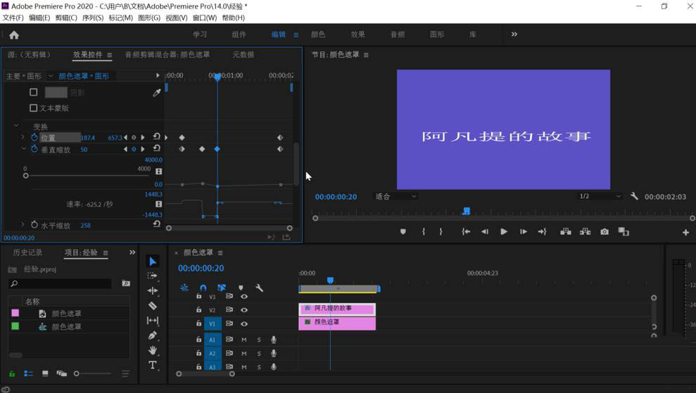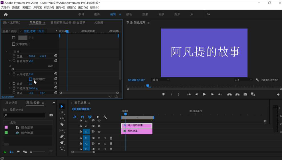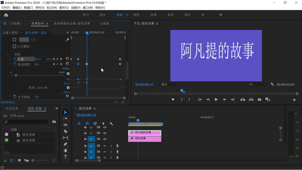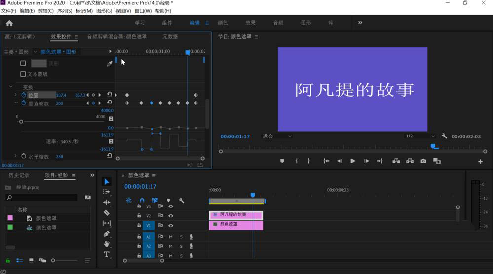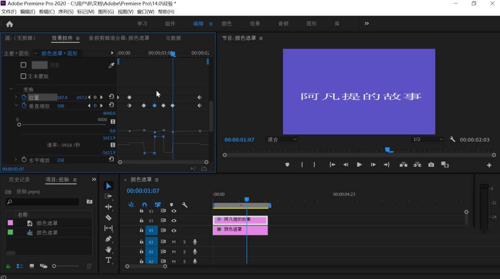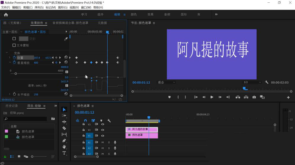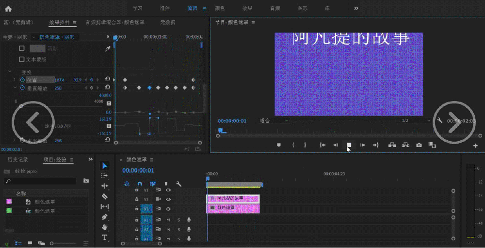 3、拖动时间轴上的文字图形和下方的颜色遮罩时间一致后点击上方工具栏上的编辑,鼠标移动到左侧的效果控件中,依次点击“文字”,“变换”,把下方“等比缩放”前的勾点击取消。之后拖动关键帧窗口的时间滑块到左侧开始处稍微有点距离的地方,点击“垂直缩放”前的时钟图标打开它的关键帧设置,可以看到已经设置了一个关键帧。