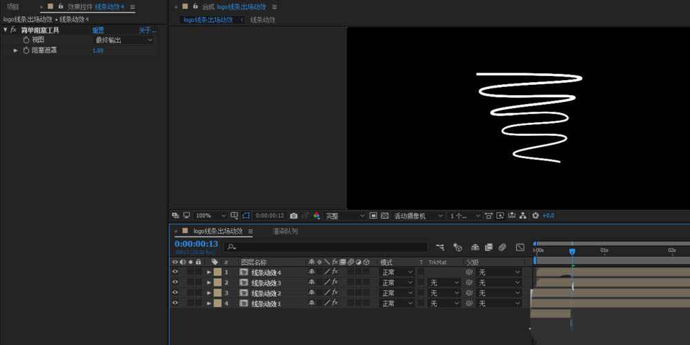 2、选中任意一个图层,按下ctrl+a选中所有的图层,按下ctrl+shift+c预合成,命名线条动效,添加简单阻塞工具(简单抑制或者simple choker),把保真的部分去掉;将阻塞遮罩设置为1,稍微修饰一下,让线条更加圆润;