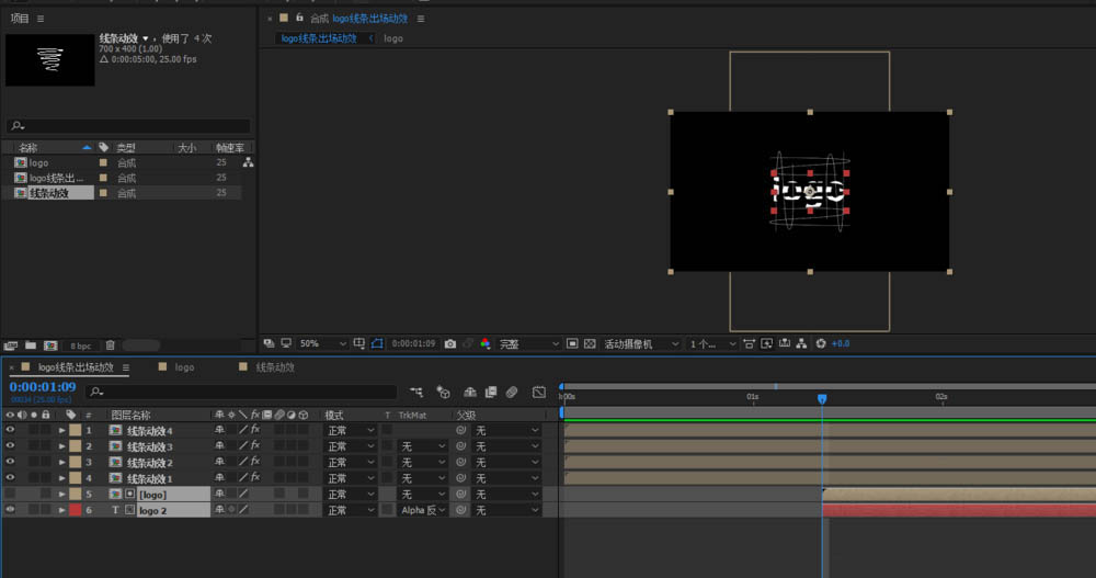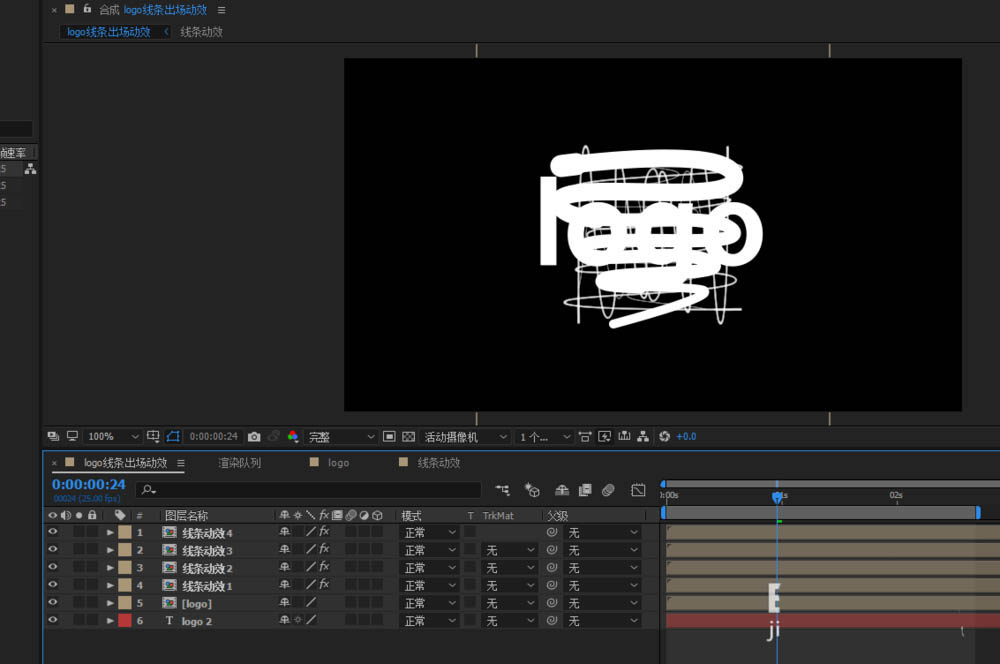 4、把logo的合成拉入到刚刚绘制线条的合成中,ctrl+t输入logo文本内容,调整好文本位置和大小,把logo放到最底层;