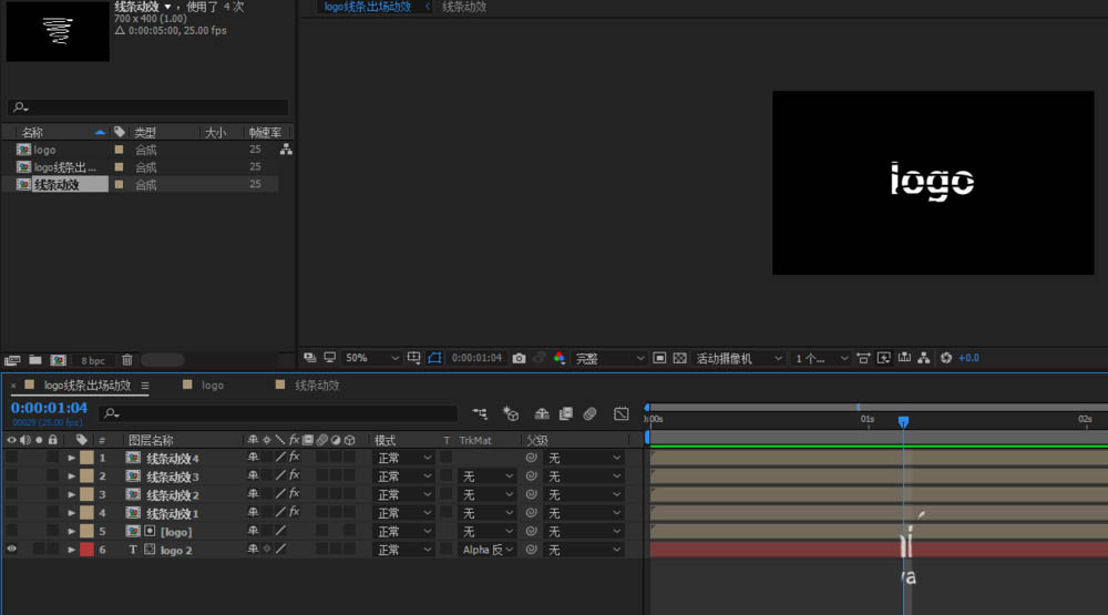 5、隐藏掉所有的描边图层,只留下logo描边和logo图层,把logo的轨道遮罩换成 反Alpha遮罩;根据实际情况去做细节的调整;