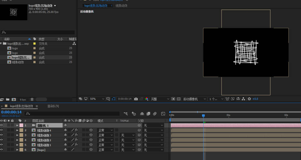 2、新建一个摄像机,将所有的图层都转为3d图层,选中logo描边和logo ctrl+shift+c预合成,命名为logo,然后将logo预合成转换成3d;