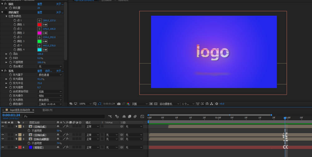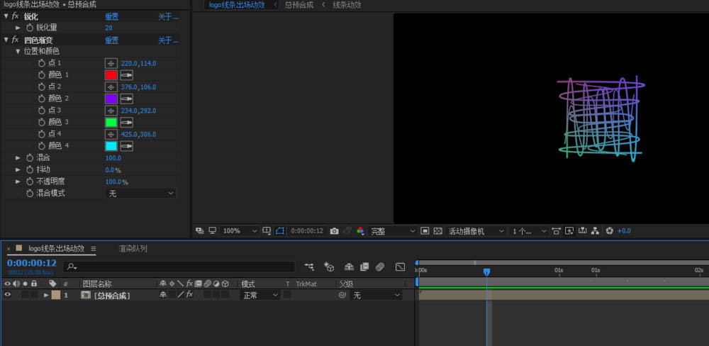 4、选中所有的图层进行预合成;给预合成添加一些锐化 ;添加四色渐变,设置自己想要的颜色;