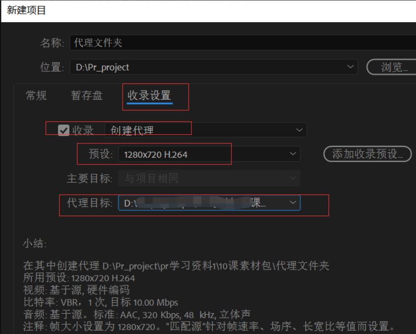 3、打开pr软件,进行代理设置(收录设置),如果ME软件没有安装的话会有提示,需要安装ME软件,代理设置如下,代理目标选择第二步创建的代理文件夹,然后点击确定