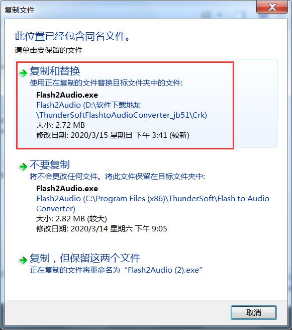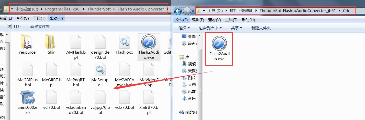9、将软件包内Crk文件夹内替换补丁粘贴到软件安装目录(默认C:\Program Files (x86)\ThunderSoft\Flash to Audio Converter)