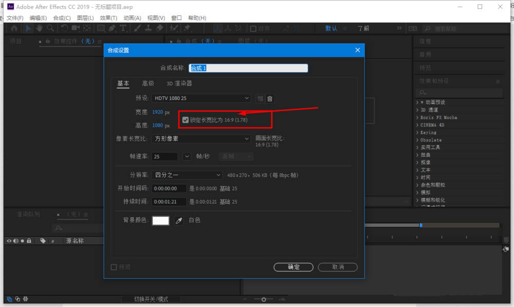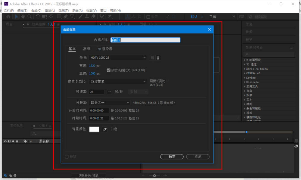 2、然后打开了一个合成设置的对话框