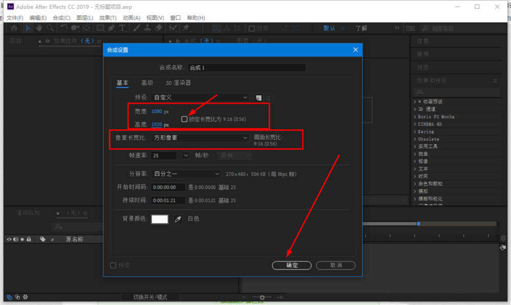 4、我们把锁定长宽比的勾选给取消,然后宽度输入1080,高度输入1920,可以看到画面长宽比位9:16了,接着点击确定