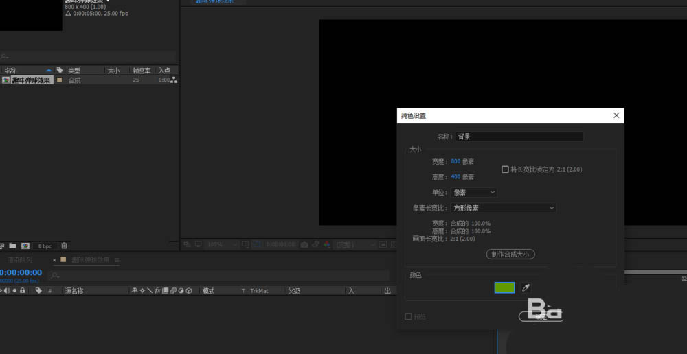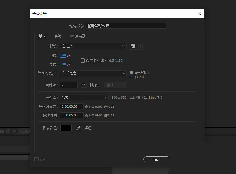 1、打开AE软件,命名趣味弹球效果,调整相应的参数。