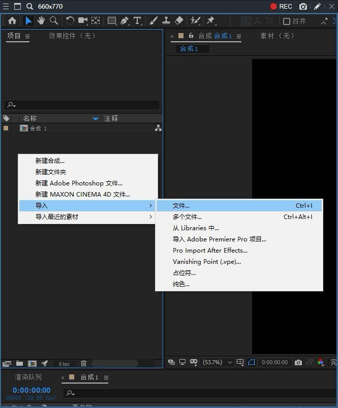 3、在左侧项目面板中,选择导入文件和素材