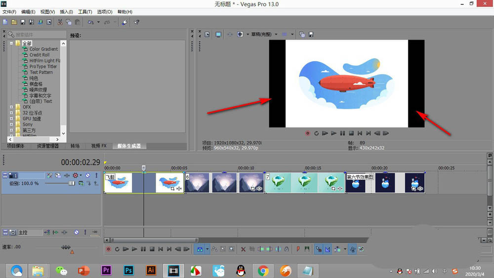 1、导入素材之后,在预览区能够看到两侧有黑边的存在。