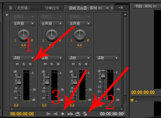 6、在音轨混合器面板上点击“R”,然后点击“录制”按钮,接着再去点击“播放”按钮,这时就可以开始录音了
