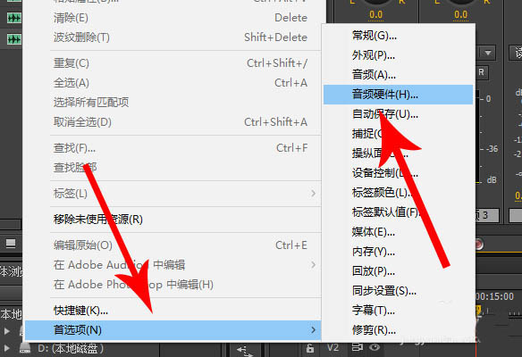 2、点击“编辑”打开下拉列表后点击“首选项”,然后再去点击“音频硬件”