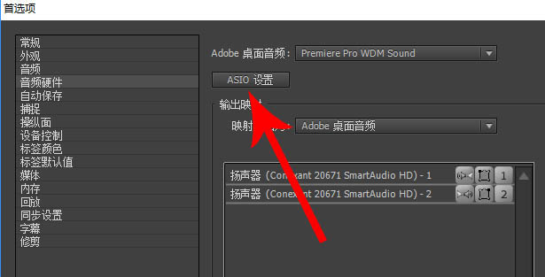 3、打开“首项-音频硬件”设置窗口后点击“ASIO设置”