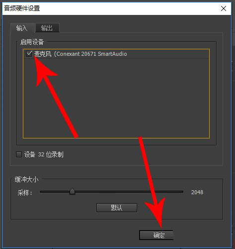 4、打开音频硬件对话框以后,在“输入”分类界面勾选麦克风,然后点击“确定”
