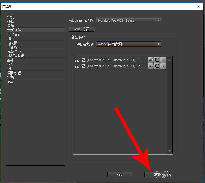 5、重新打开“首选项-音频硬件”设置窗口以后点击“确定”保存设置