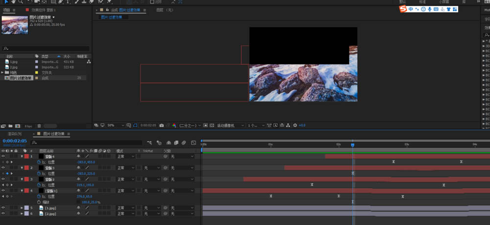 5、回到两秒处,选择蒙版1,ctrl+d复制纯色层,命名为蒙版2,选中蒙版2按下u键,调用出所有关键帧,选中所有关键帧,将蒙版2往下移动,将他和蒙版1进行上下拼接,同理复制得到蒙版3,同理操作将其和蒙版2进行上下的拼接;这样三个纯色层蒙版就把整个画布进行了无缝覆盖了,这样基本有了一个幻灯片切换的效果了;蒙版4同理操作;