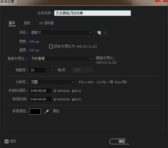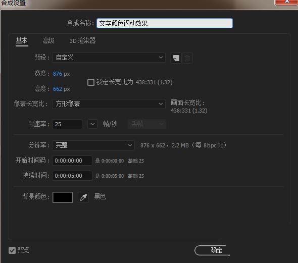 1、打开AE软件,命名文字颜色闪动效果,调整相应的参数。