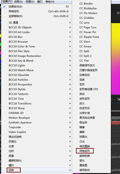 3、选中纯色层,添加网格变形效果,设置行列数,然后给扭曲网格属性K关键帧,让画布颜色区域有个变化。