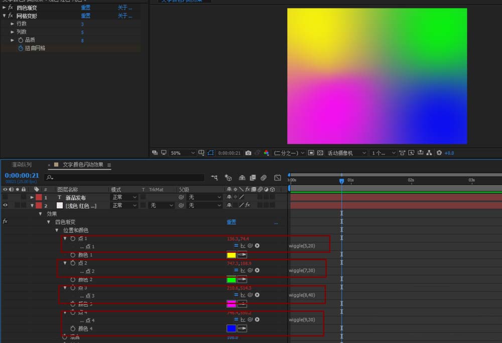 4、分布按下四色渐变的四个点前的小秒表,给他们添加wiggle()表达式,让颜色动起来。