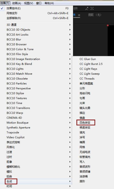 2、在时间上右击新建一个纯色层,颜色随意,给纯色层添加四色渐变效果,设置自己想要的颜色。