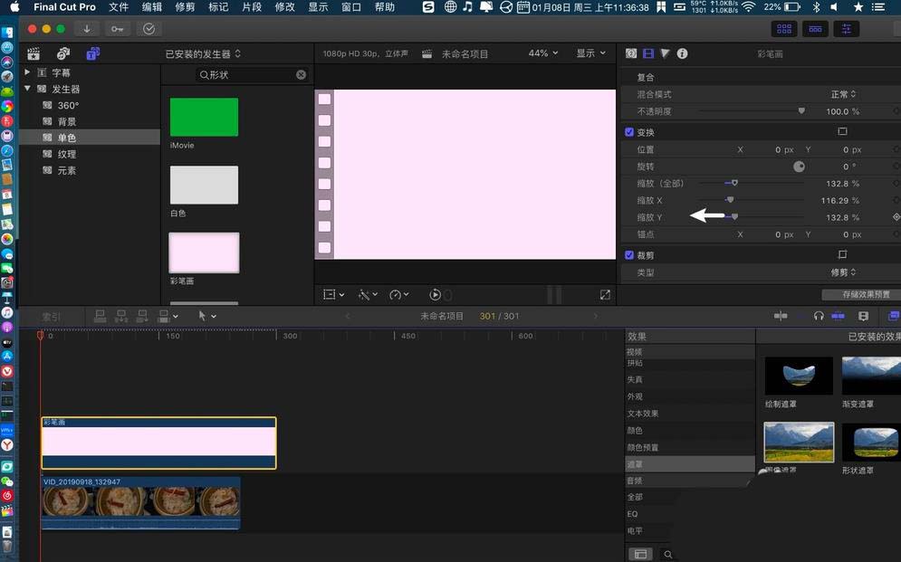 3、把铅笔画拖到素材上,缩放y这里左侧拖拉。