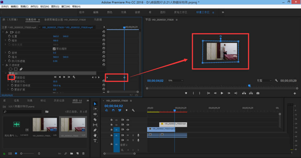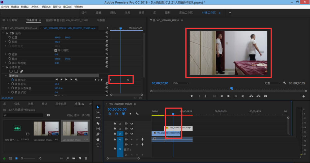 2、点击视频图层按住alt键向上拖动复制视频图层,然后把复制的视频往后拖一点错开两个图层。选中复制图层点击效果控件在不透明度里选择矩形蒙版,调整矩形蒙版的大小使画面出现两个人物,然后调整羽化值。