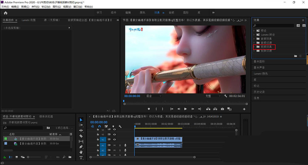 3、在右上角找到【效果】,打开【视频效果】。