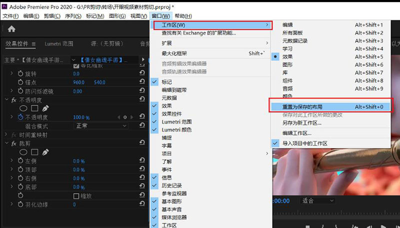 5、点击【重置为保存的布局】,PR内的布局又重新回到之前的模样。