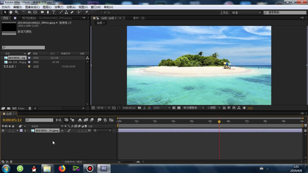 1、首先就是素材的导入,这个导入的方法很简单,不再赘述,将素材库的素材拉至合成里面的时间线上