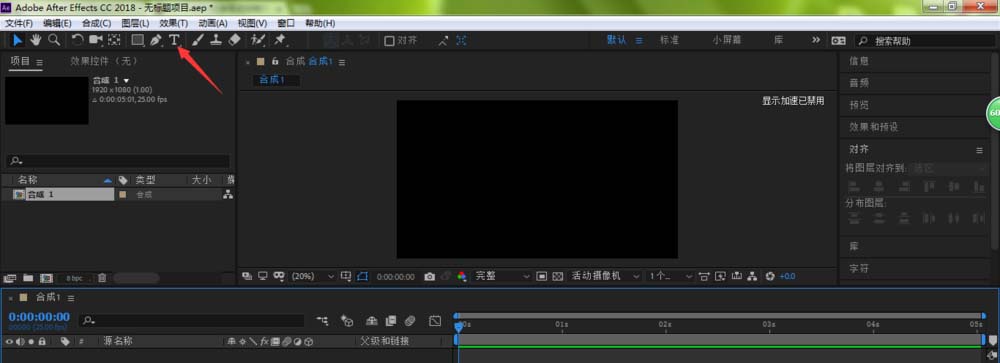 1、打开AE,创建一个新合成,点击界面上方的文字工具T