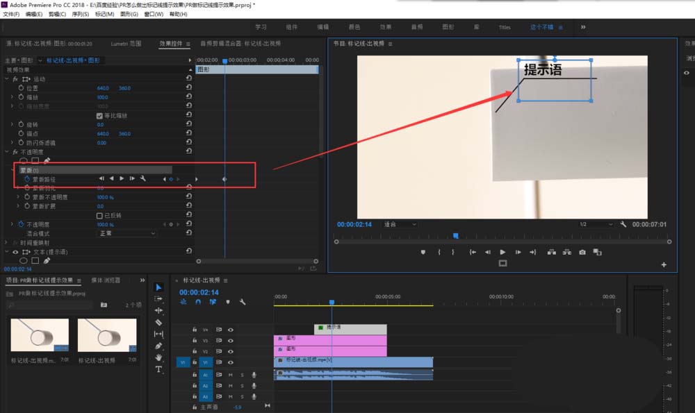 5、选中输入的提示文字,在效果控件中为其添加一个蒙版,然后为这个蒙版路径来设置关键帧动画,让这个文字在提示线出现之后在从无到有出现即可。