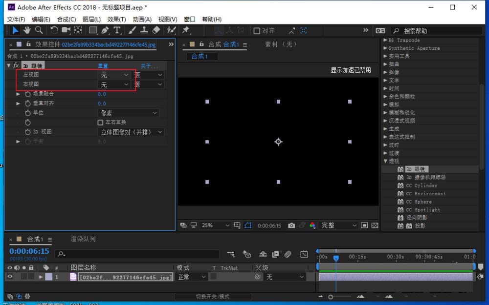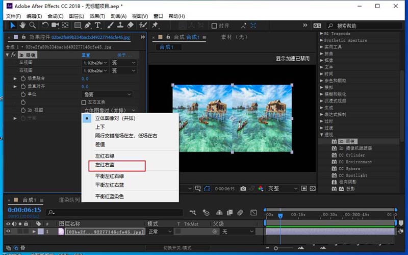 4、在效果控件设置3d眼镜的各项参数,将左视图和右视图都设置成同一个素材。