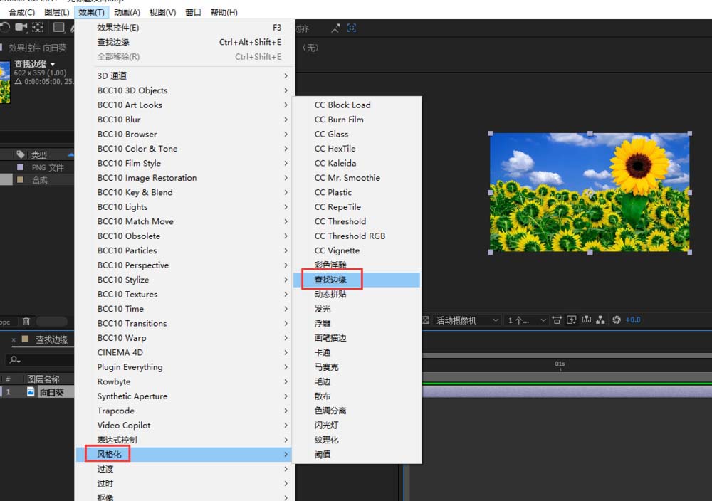 3、选中图片素材,添加查找边缘;效果-风格化-查找边缘;