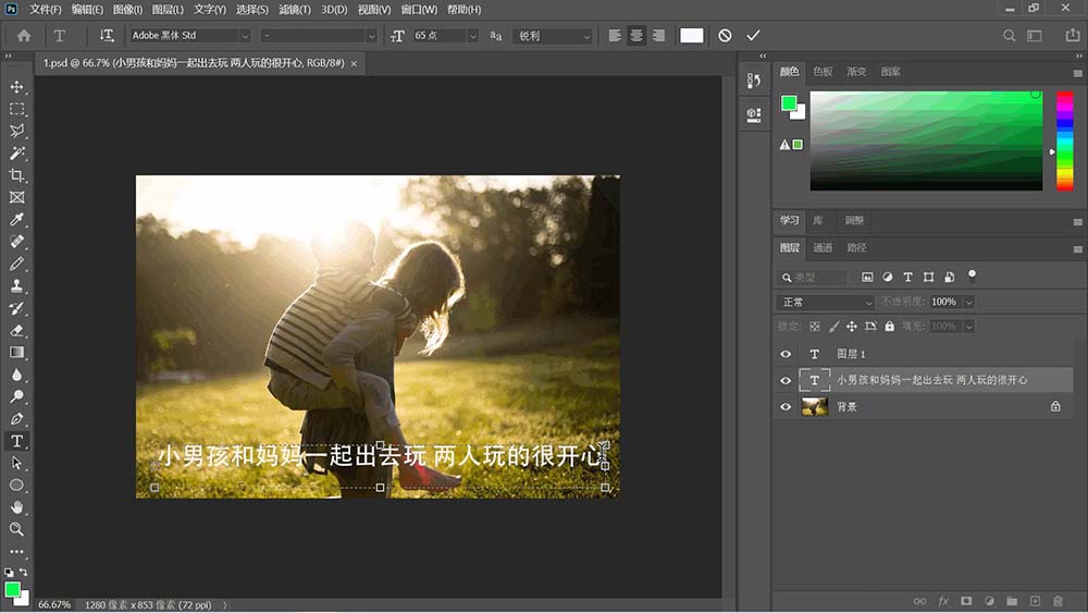 2、点击文字工具,输入文字并调整文字格式后导出为psd格式文件。