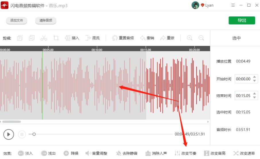 第二步、选择需要处理的音频片段,点击“改变节奏”功能;