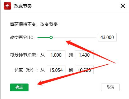第三步、在这里,我们可以通过拖动“改变百分比”的方式调整音频的节奏;下图所改变的是:(1)原来的1个节拍变成了1.43个 (2)15秒的音频缩短成10秒了;最后点击“确定”即可;