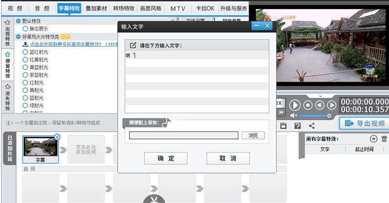 3、上方的菜单栏中选择字幕特效;双击要在视频界面添加字幕的位置;在弹出来的文字输入框中输入文字;文字输入好后,点击确定。