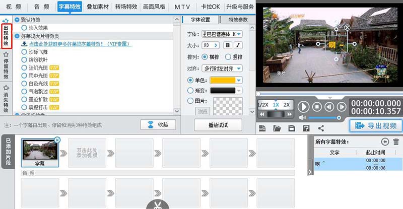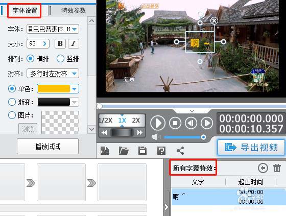4、在右下角的所有字幕特效栏选中添加的字幕,在字体设置栏调整字体的颜色和大小。