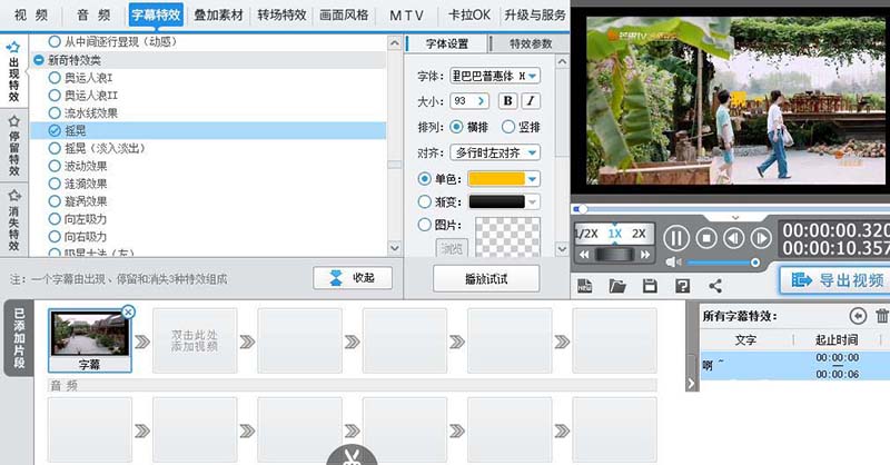 6、选择新奇类特效中的摇晃,会看到右侧视频界面有该特效的预览效果,点击播放试试,字幕的颤抖效果就加好了,快去试试吧。