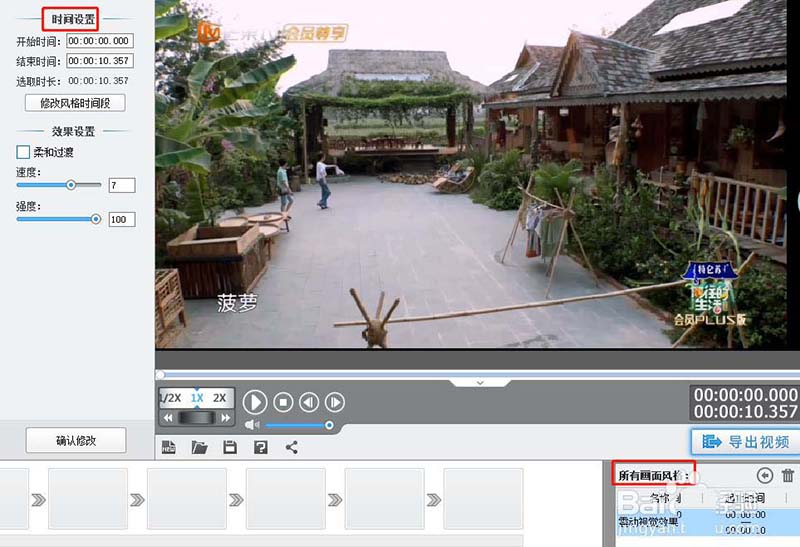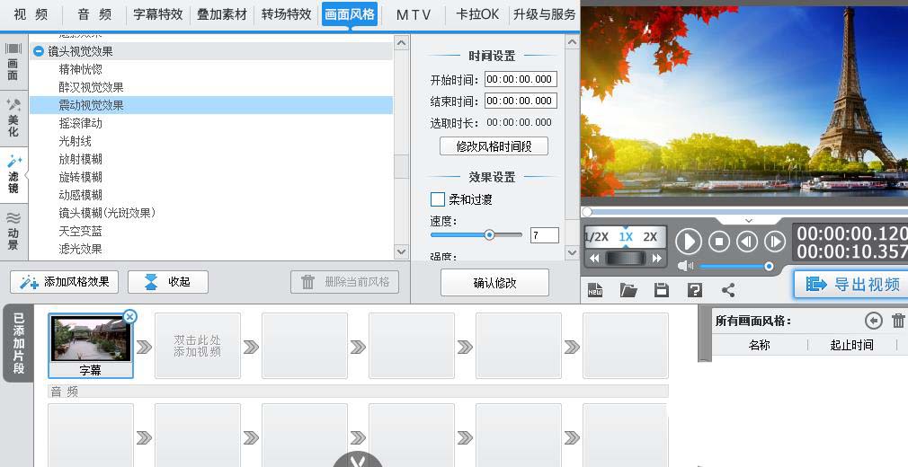 6、在右下角的所有画面风格栏,可以看到添加的画面风格;选中画面风格,在时间设置栏可以调整风格开始和结束的时间;在效果设置栏还可以该调整风格的效果。
