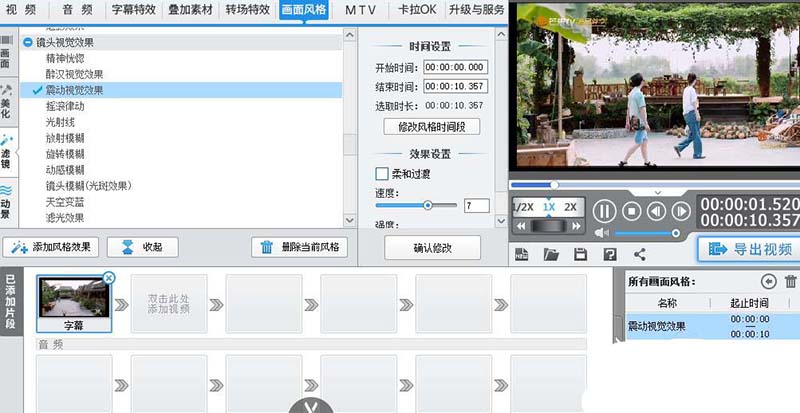 5、点击添加风格效果,选择为当前片段添加风格,也可以选择为指定时间段添加风格,点击确认修改,会看到视频画面抖动效果已经制作完成。