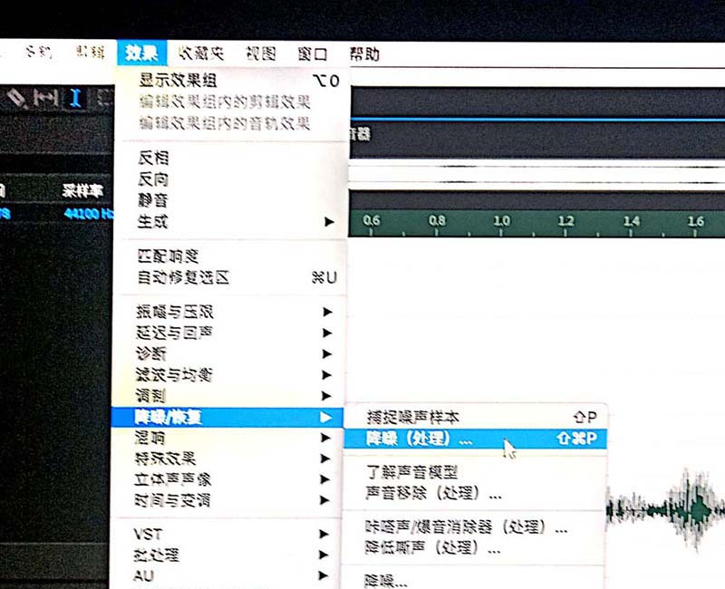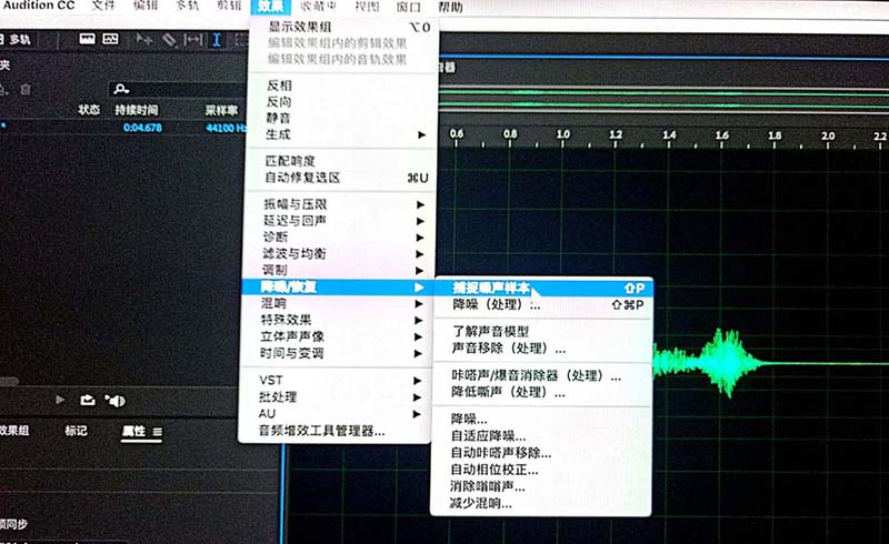 3、选择「效果」「降噪/恢复」「捕捉噪声样本」