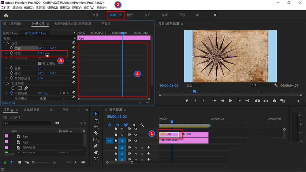 5、鼠标左键点击选中第一段素材后移动到上部工具栏,依次点击“编辑”,“效果控件”,“运动”,找到下方的“缩放”,鼠标点击右边的数字不放左右拖动改变数字大小,同时观察右边视频预览区的画面大小,调节到合适位置后释放鼠标左键。可以看到,”运动“右边的小窗口没有显示关键帧。