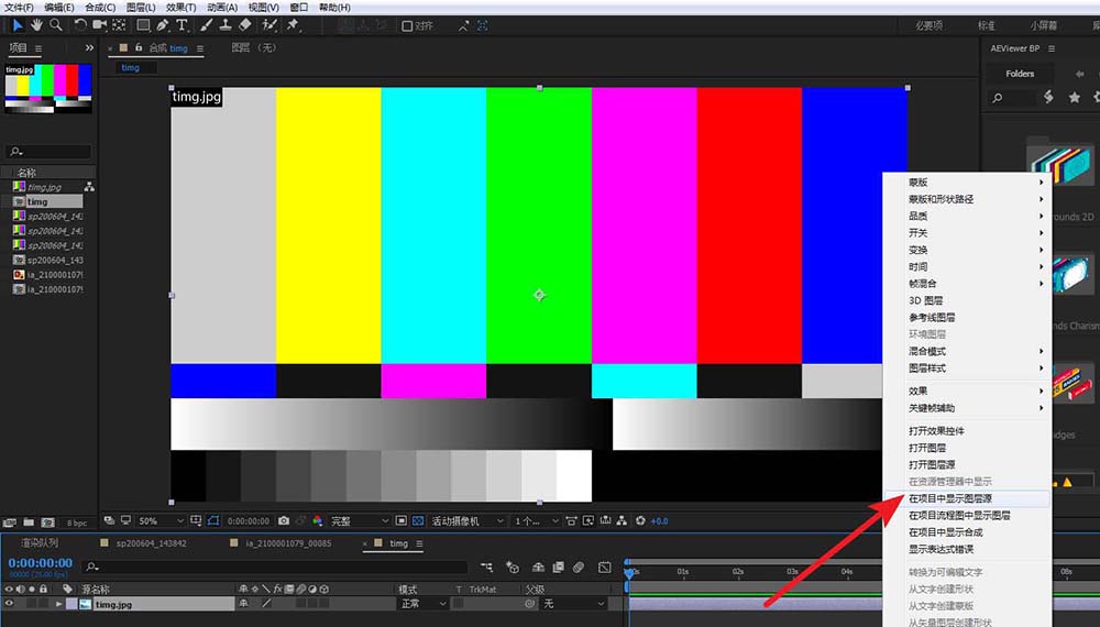 选中素材,右击找到并点击-在项目中显示图层源