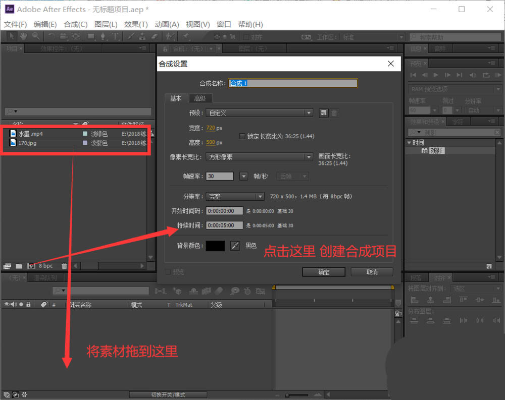 1、打开ae,新建合成项目,导入水墨素材和照片