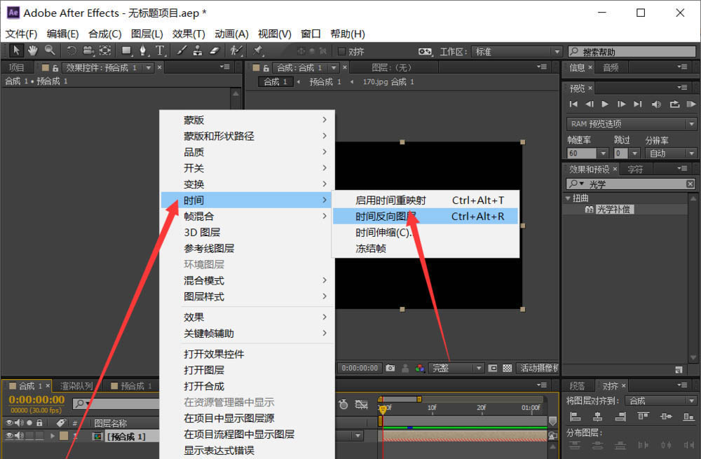 4、双击人物照片图层——打开预合成——添加一个光学补偿。找到后,鼠标点中效果不松手,直接拖动效果到图层上,水墨滴落,水面或者说平面会有一个涟漪的扭曲效果,这里的光学补偿就是为了添加一个这样的物理现象