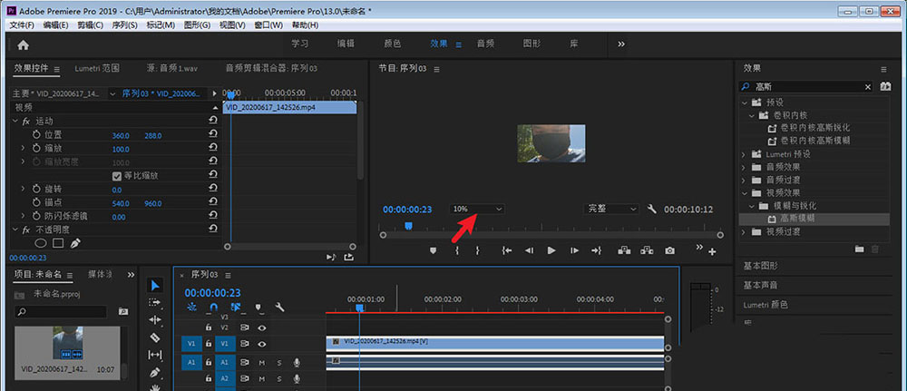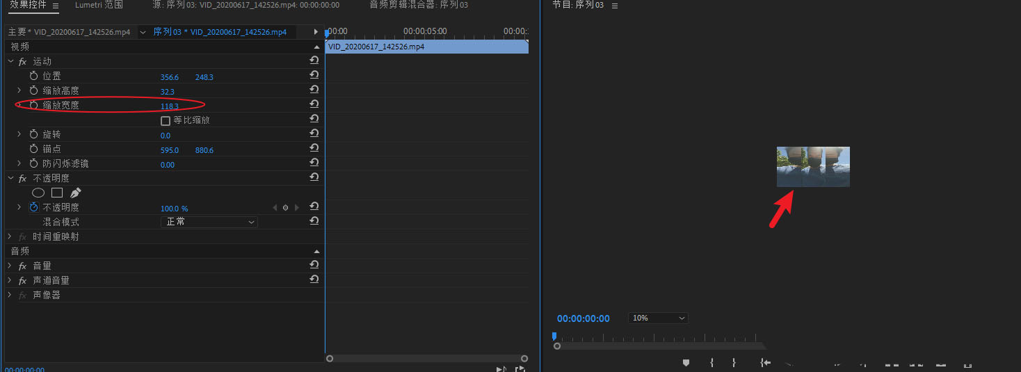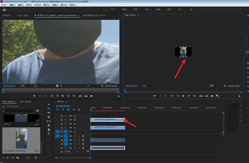 1、从素材箱,就是pr上的,把竖屏视频拖入时间轴,然后预览窗显示设置为10%。