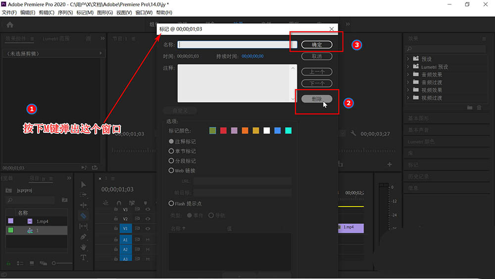 5、在键盘上按下M键,弹出如下图所示的标记对话框,点击下方的“删除”后点击“确定”。