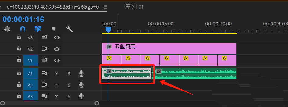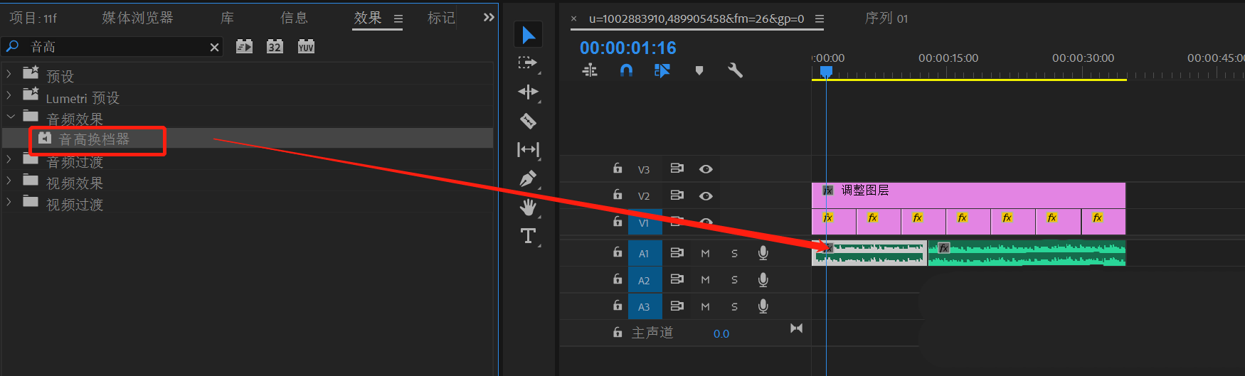 6、拖动“音高换档器”到音频素材上。