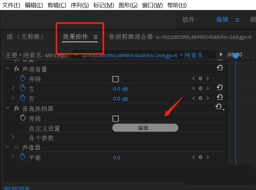 7、打开效果控件,在“音高换档器”中点击“编辑”。